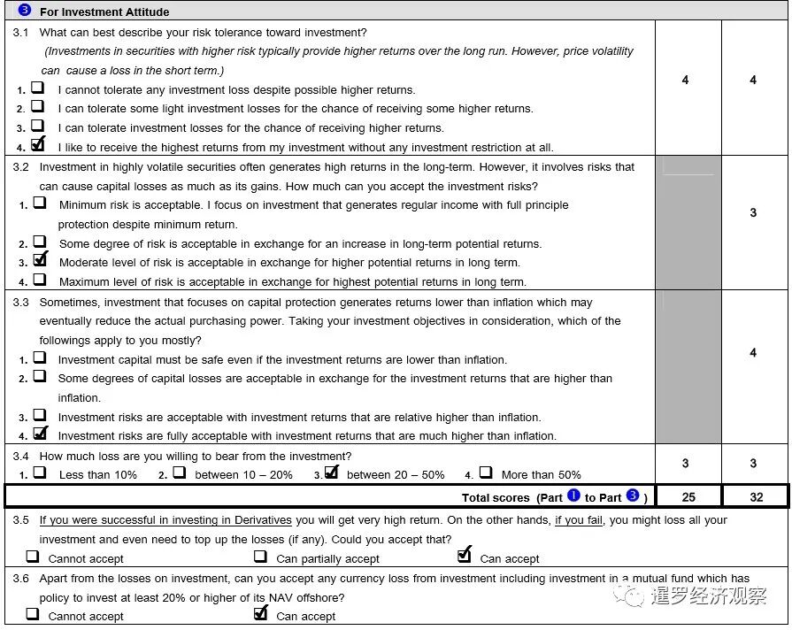 这里的风险测评大家根据自身实际情况填写就好。但想要开通衍生品账户的话,风险测评要尽量填的高一些,因为高风险产品有一定的限制。这里提供一家券商的风险测评内容,以供大家参考。