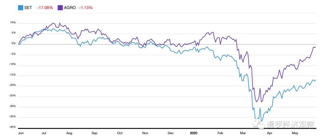 了解十家最值得投资的农业板块之后,让我们回过头看看整个AGRO板块的情况。AGRO总市值占整个SET市场的8.51%,由于其行业多为生活必需品,整体波动相对较小,2020年以来AGRO指数收益要高于SET指数。2月以来,受国际疫情影响,多家食品及餐饮企业股价大幅下跌,随着疫情状况好转,泰国紧急状态逐步解封,相关企业股价长期有望回升。