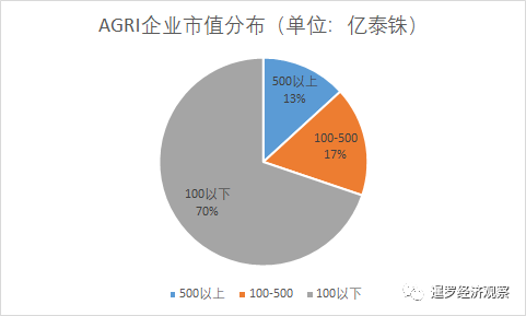 SET共有8个板块分类,农业板块(AGRO)是非常重要的一部分,有多家优质的泰国大型企业。大家熟悉的正大集团旗下正大食品就是整个农业板块市值最大的企业。农业板块又分为两个子版块“农业”(AGRI)和“餐饮”(FOOD),分别有12家(AGRI)和41家(FOOD)上市企业。其中,市值在500亿泰铢以上的企业共7家,100亿泰铢以上的共16家。大部分企业市值在30亿泰铢左右,约6亿人民币。由于泰国市场整体规模较小,流动性也不比A股市场,市值较小的泰国企业风险相对较大,也不一定能够带来与高风险相匹配的高收益,因此我们建议外国投资者多关注市值相对较大的优质企业。