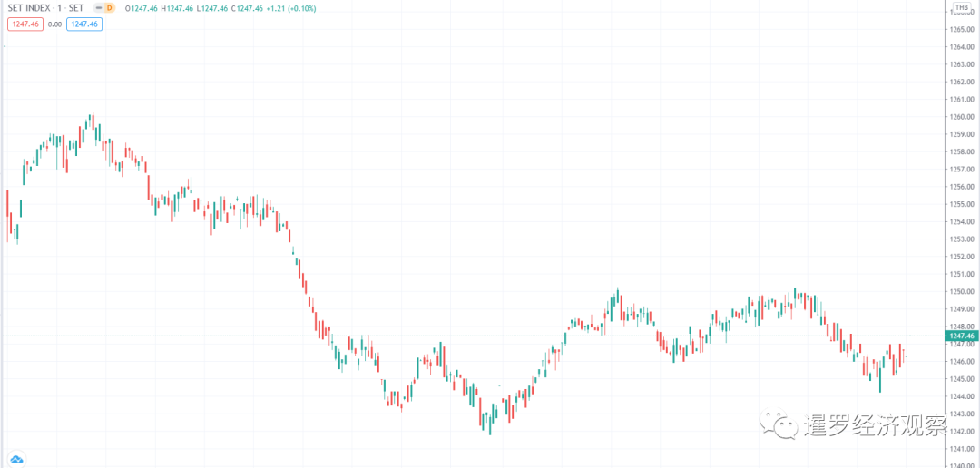 今天SET全面下跌,最低跌至1241点,尾盘有所回升。能源板块跌幅2.92%,PTT,GULF,BANPU等大型企业均有较大跌幅。服务业,科技业也跌幅较大。今天尾盘,上午同样下跌的消费股和银行股开始拉升,消费股最终上涨2.7%,银行股也由红转绿,涨幅0.86%,Kbank 等9家银行上涨。
